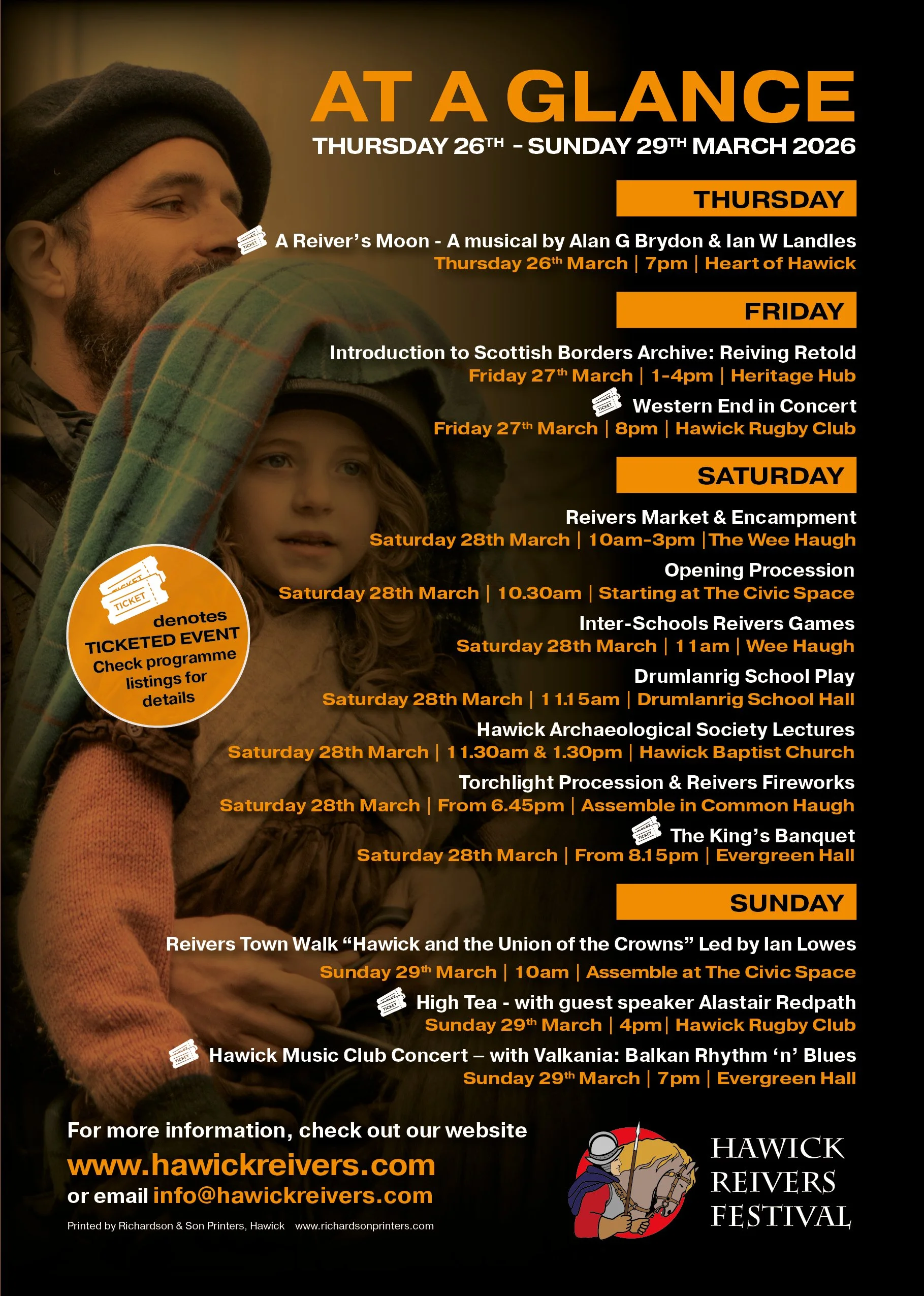 Begin the day with a heritage-themed town walk led by Ian Lowes. Then at 4pm, join us for a high tea at Hawick Rugby Club, with a guest speaker lined up to take us through to the conclusion of another excellent festival.